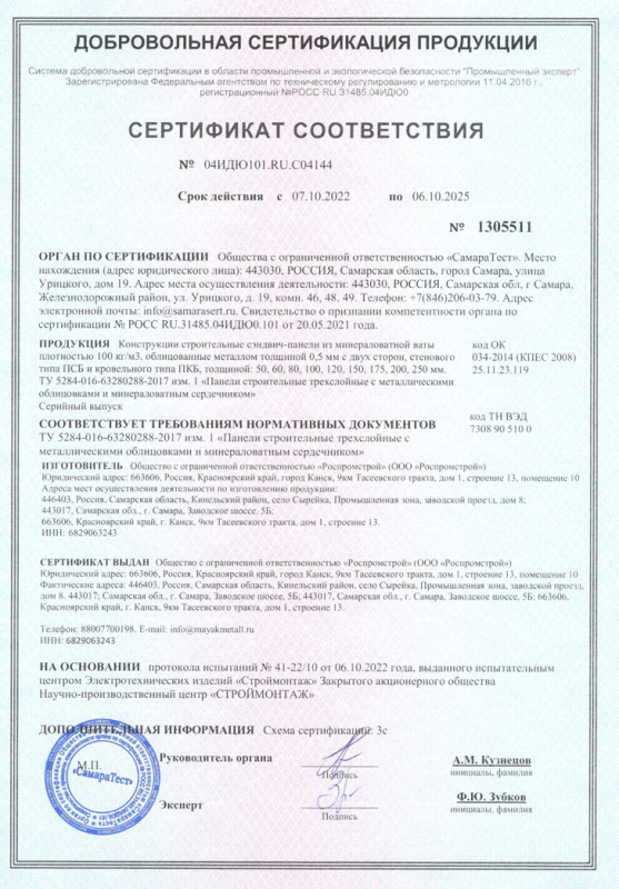 Сертификат соответствия сэндвич-панели ГОСТ
