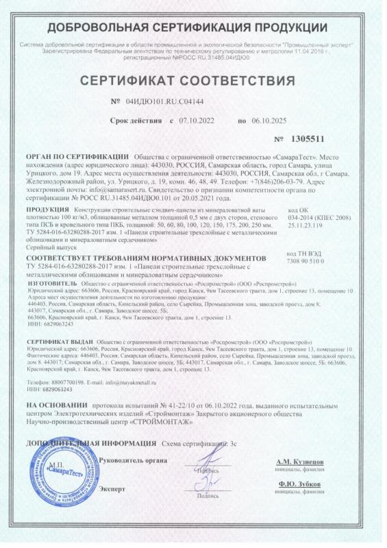 Сертификат соответствия сэндвич-панели ТУ